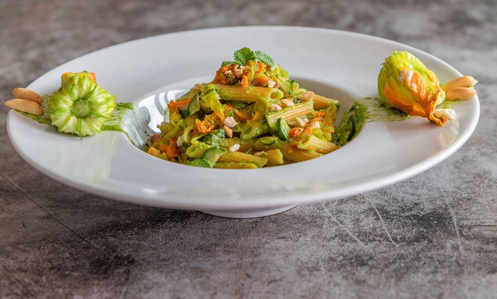 Pasta di lenticchie con crema di zucchine e fiori di zucca