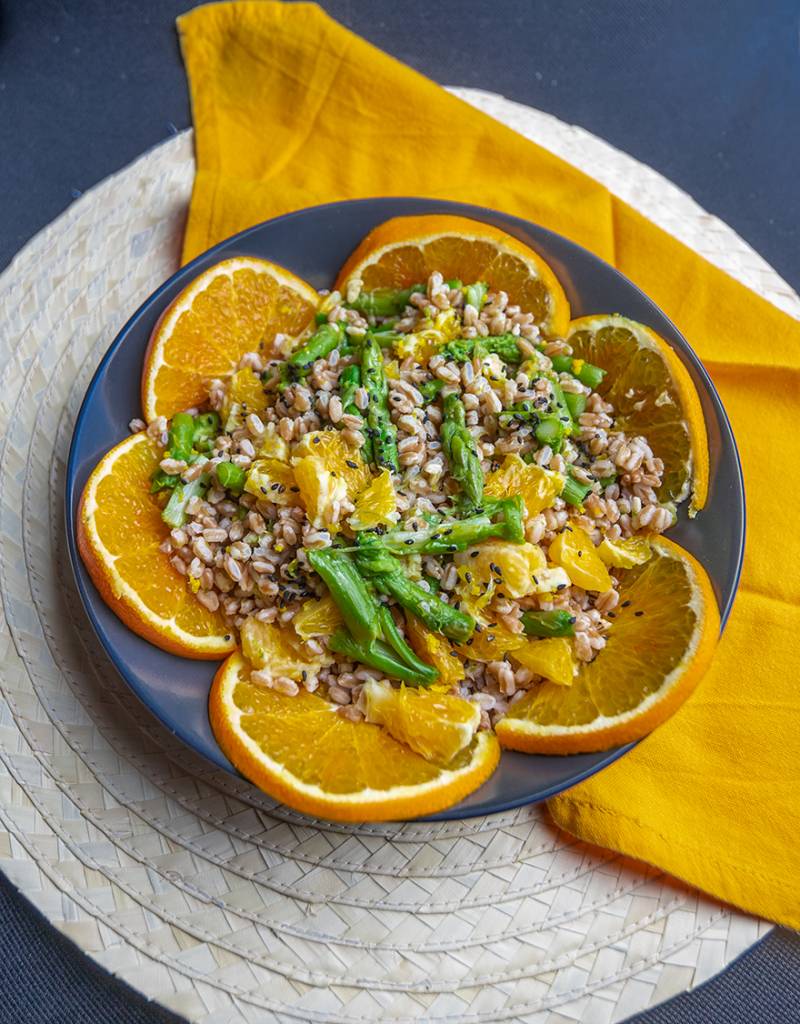 Insalata di farro con arancia e asparagi