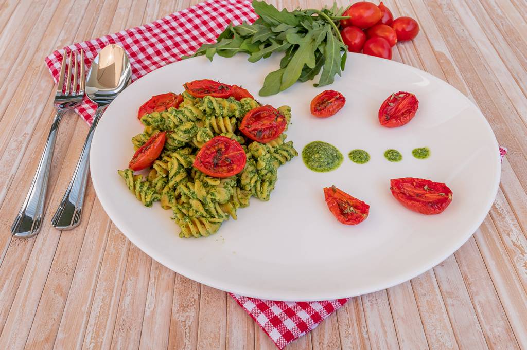 Pasta di legumi con pesto di rucola e pomodorini confit